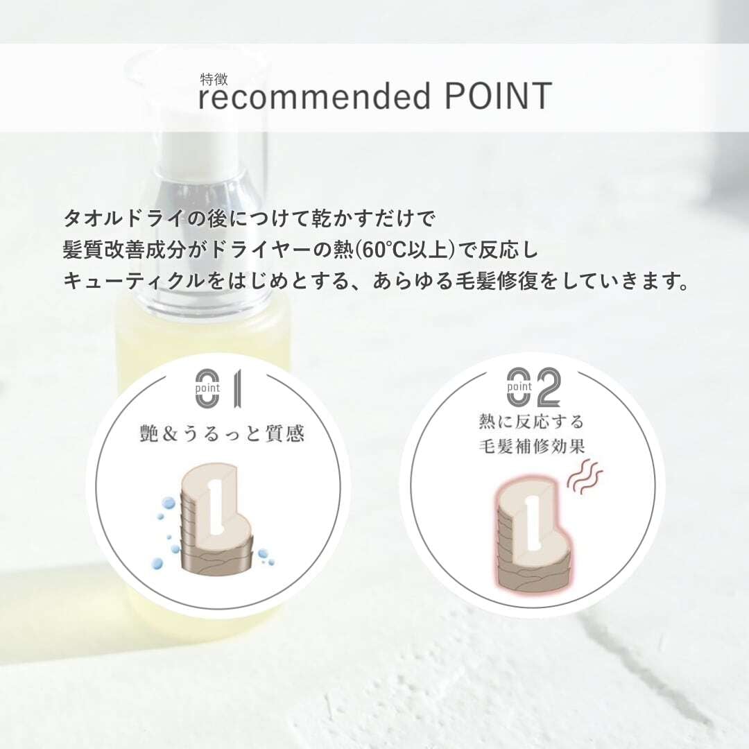 補修効果や指通りやまとまり等を実感しやすくなっております。特に質感の面では毛髪への馴染みやお客様が好むように日本有数のオイルメーカーと試行錯誤を繰り返しました。