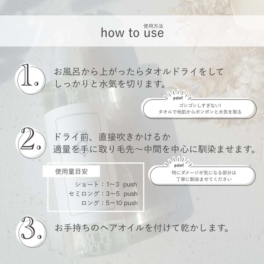 ハイダメージ・熱ダメージのあるお客様、毛髪に柔らかさを与えたいお客様に最適なセラムタイプのアウトバスです