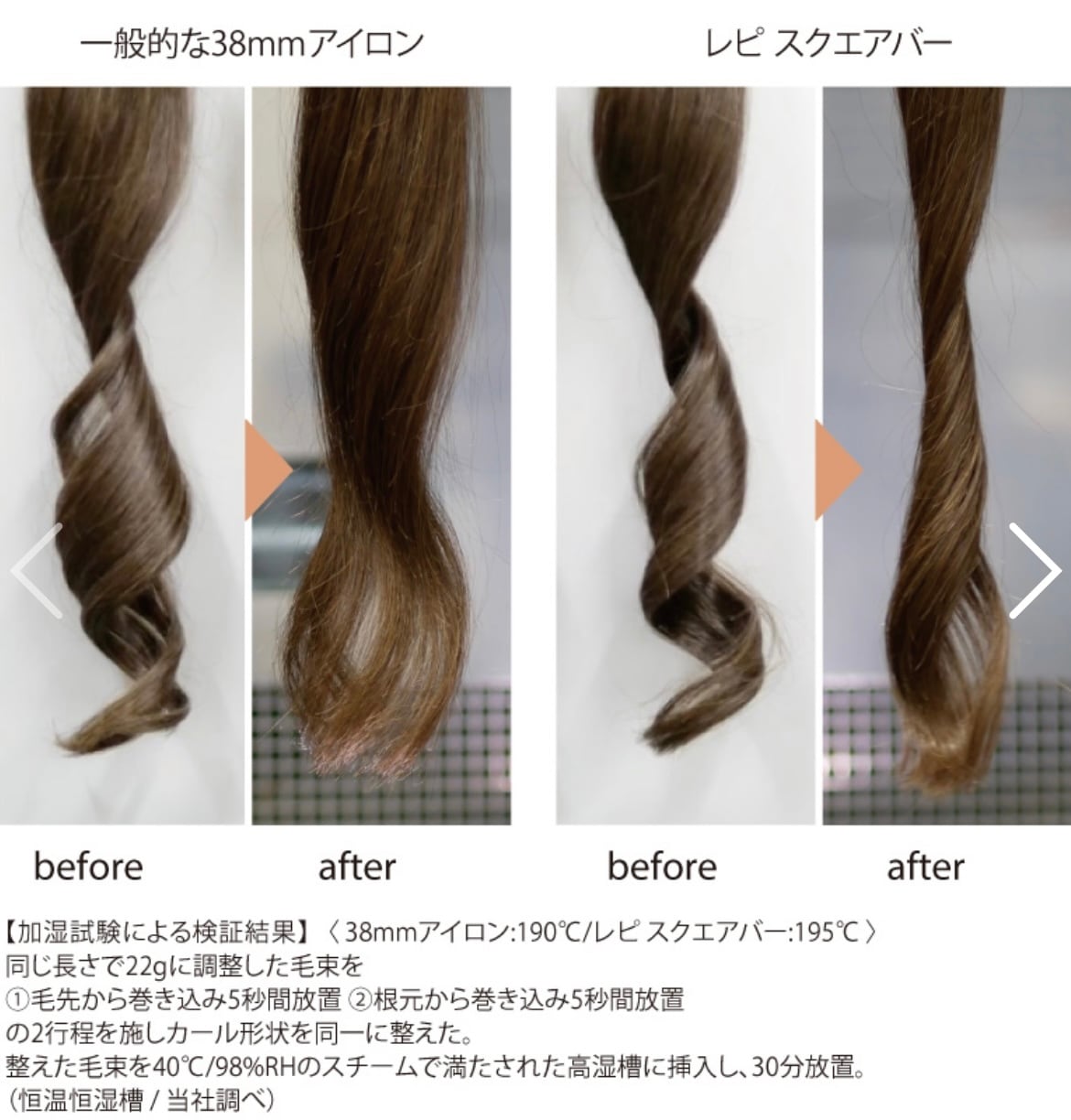 独自に開発した、四角形と円形を掛け合わせたスクエア型のカールアイロンは、程よいテンションがかかることで、40mmという太巻きのパイプながら、弾力とツヤのあるカールが長続きします。さらに、巻く時にありがちな「クレパス=髪が折れたようなアイロンの挟み跡」がつきにくい点もポイント。