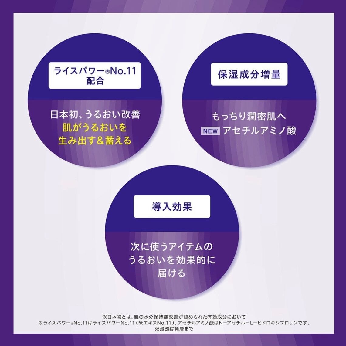ライスパワーNo.11(米エキスNo.11)※、精製水、1,3-ブチレングリコール、エタノール、濃グリセリン、ジグリセリン、N-アセチル-L-ヒドロキシプロリン、アセチル化ヒアルロン酸ナトリウム、イリス根エキス、カンゾウ葉エキス、チョウジエキス、酵母エキス(1)、天然ビタミンE、2-オクチルドデカノール、エデト酸二ナトリウム、キサンタンガム、クエン酸、シクロヘキサンジカルボン酸ビスエトキシジグリコール、ジェランガム、テトラオレイン酸ポリオキシエチレンソルビット、ピロ亜硫酸ナトリウム、ポリオキシエチレンコレステリルエーテル、ポリオキシエチレン硬化ヒマシ油、リン酸一水素ナトリウム、植物性スクワラン、無水エタノール、フェノキシエタノール、メチルパラベン、香料