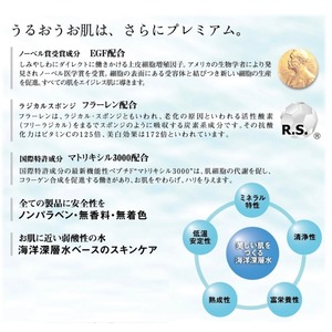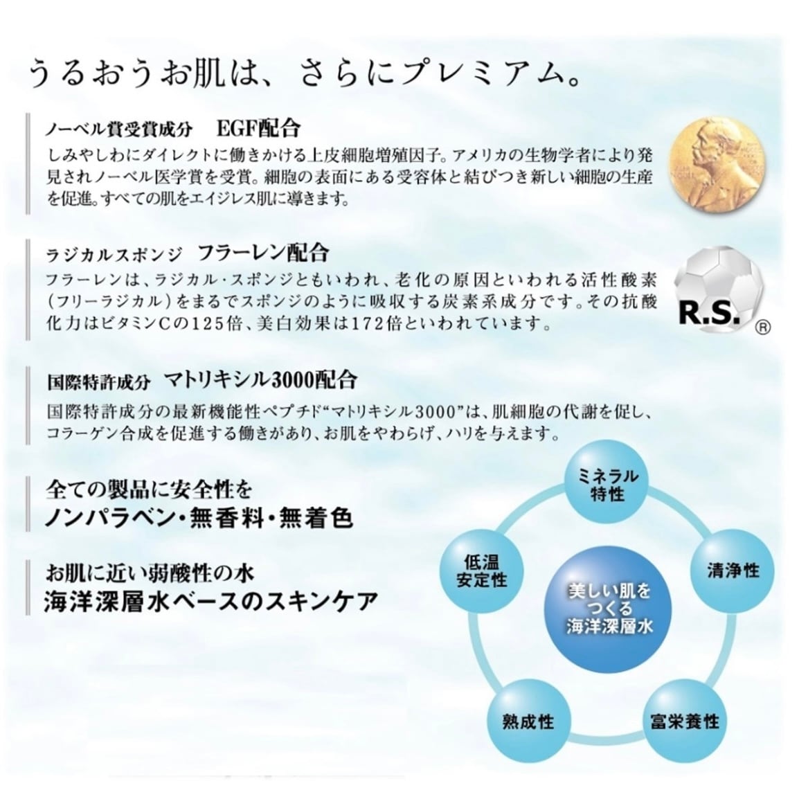 「海洋深層水」をふんだんに使い、抗酸化力アップをはじめ、国際特許成分「マトリキシル3000」を配合。