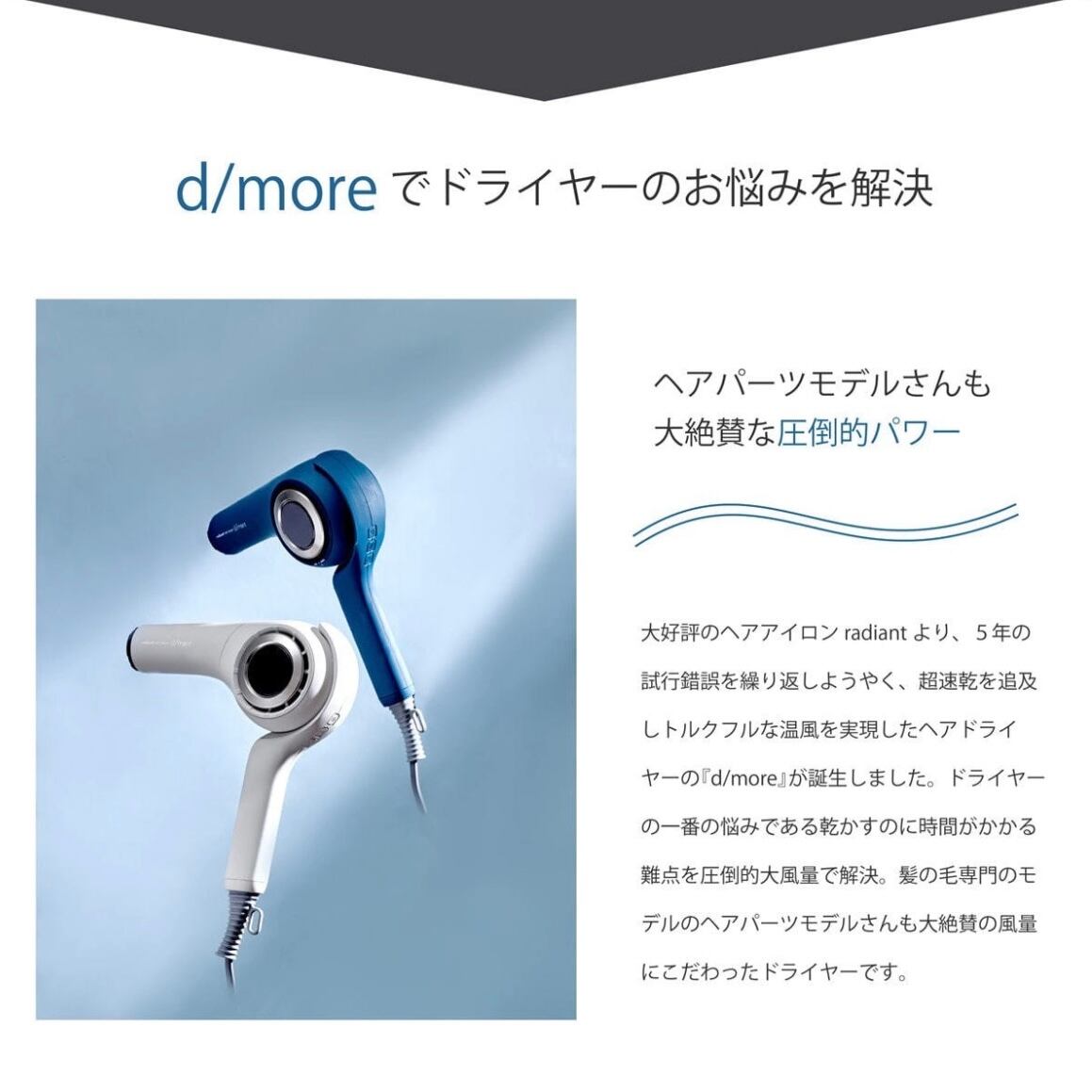 大好評のヘアアイロンradiantより、5年の試行錯誤を繰り返しようやく、超速乾を追及しトルクフルな温風 を実現したヘアドライヤーの『d/more』が誕生しまし た。ドライヤーの一番の悩みである乾かすのに時間がかかる難点を圧倒的大風量で解決。