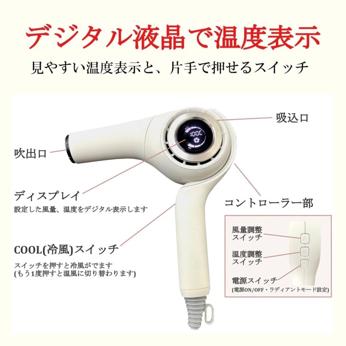 また、遠赤外線を出すことによって髪だけでなく頭皮を温めることができる。髪の毛の中に残しておきたい水分や栄養分を残したまま髪を乾燥させることが出来 ます。