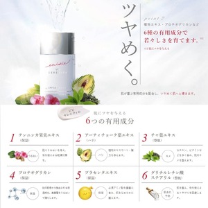 植物エキス・プロテオグリカンなど6種の有用成分で、ツヤめく肌へと導きます。