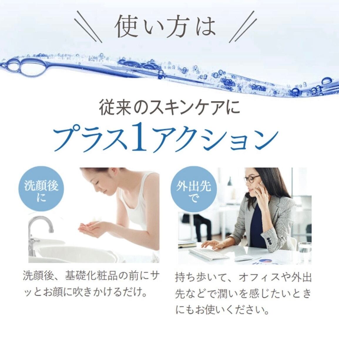 洗顔後、基礎化粧品の前にサッとお顔に吹きかけるだけ。