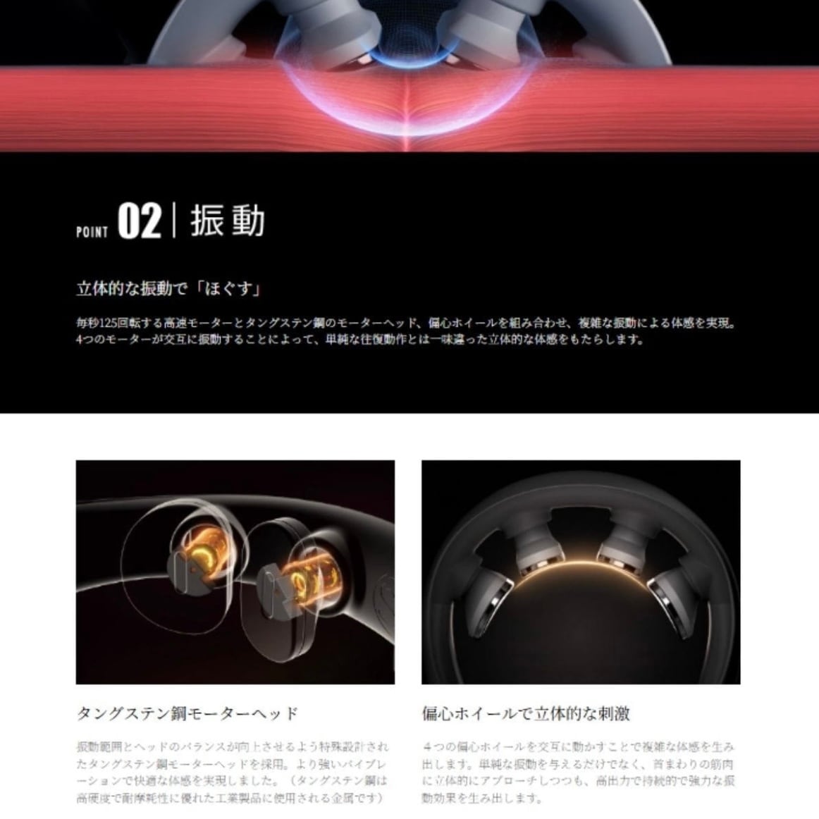中周波EMSによる筋肉刺激と、モーターによる物理的な振動、赤色LED、ヒーターによる直感的な温かさ、異なる4つの機能が組み合わさる事で立体的で、やさしい使い心地を実現しています。