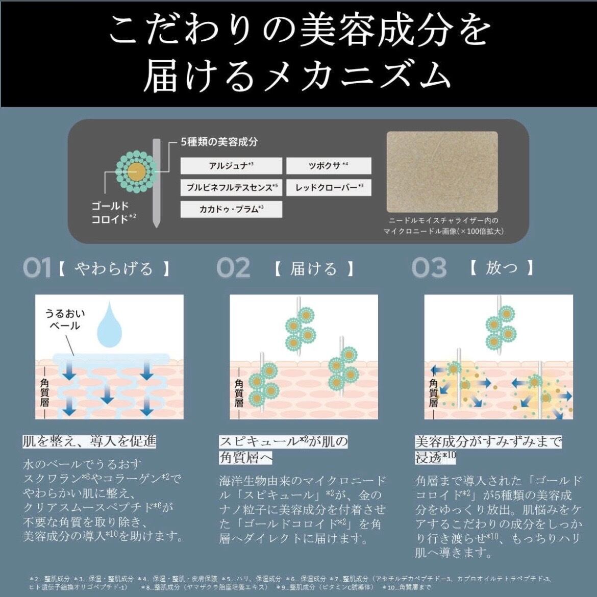ニードルスピキュールに付着させた美容成分 が肌をやわらげ、すみずみまで浸透。