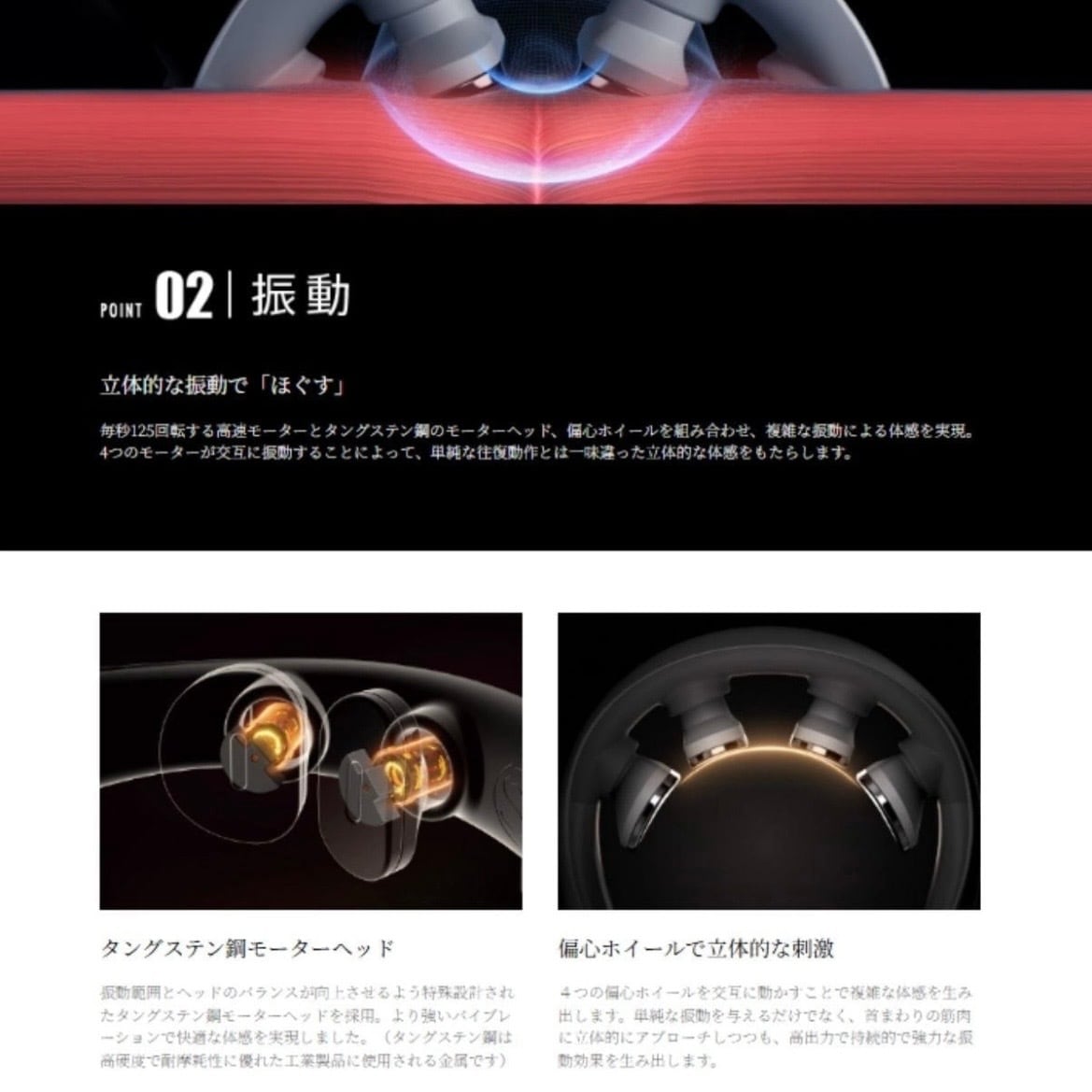 中周波EMSによる筋肉刺激と、モーターによる物理的な振動、赤色LED、ヒーターによる直感的な温かさ、異なる4つの機能が組み合わさる事で立体的で、やさしい使い心地を実現しています。