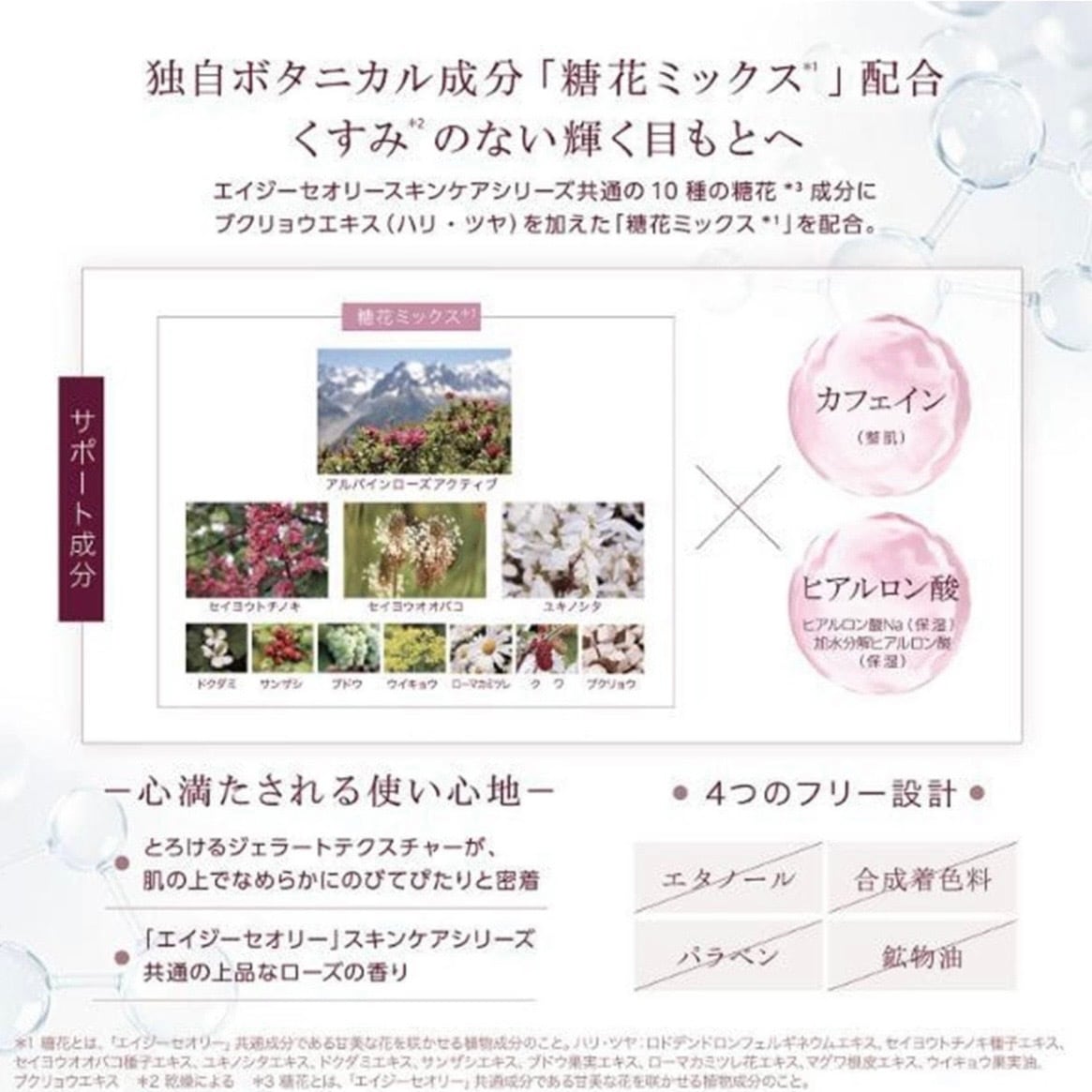 ハリ・ツヤ:アルパインローズアクティブ(ロドデンドロンフェルギネウムエキス)、セイヨウトチノキ種子エキス、セイヨウオオバコ種子エキス、ユキノシタエキス、ドクダミエキス、サンザシエキス、ブドウ果実エキス、ローマカミツレ花エキス、マグワ根皮エキス、ウイキョウ果実油、ブクリョウエキス