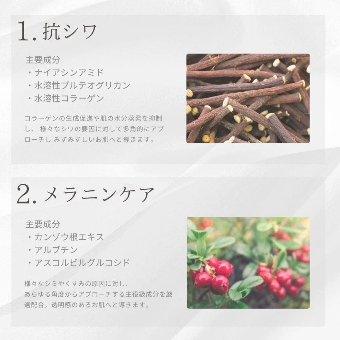 最先端の成分で肌結果にこだわるとともに、誰もが安心して、長くご愛用いただけるよう植物由来成分を多く採用した安全で優しいスキンケア