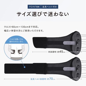延長ベルト付きで、ウエスト60cm~130cmまで対応。幅広い体型の方にご使用いただけます。
