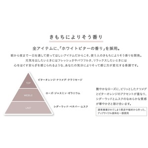 元気を出したいときにはフレッシュさやパワフルさ、リラックスしたいときには心をほぐす安らぎを感じられるような、気分によりそって感じ方が変化するホワイトビターの香りを全アイテムに採用しました。