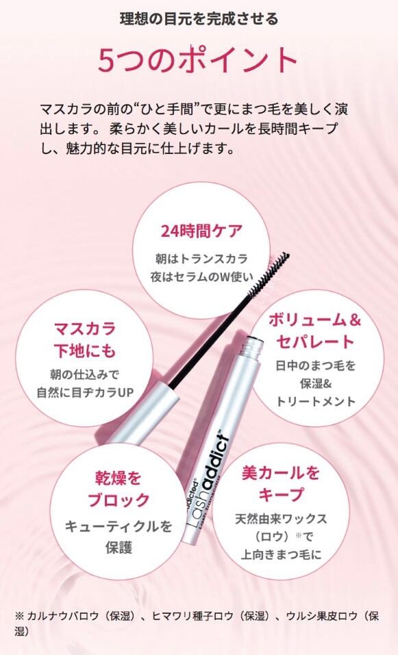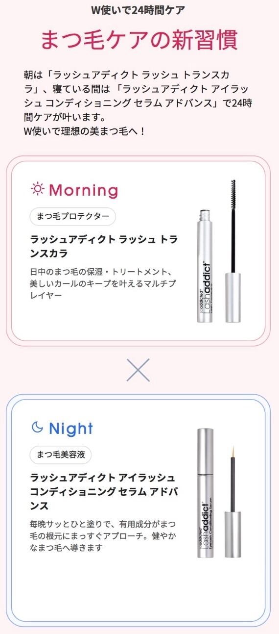 朝は「ラッシュアディクト ラッシュ トランスカラ」、寝ている間は 「ラッシュアディクト アイラッシュ コンディショニング セラム アドバンス」で24時間ケアが叶います。
